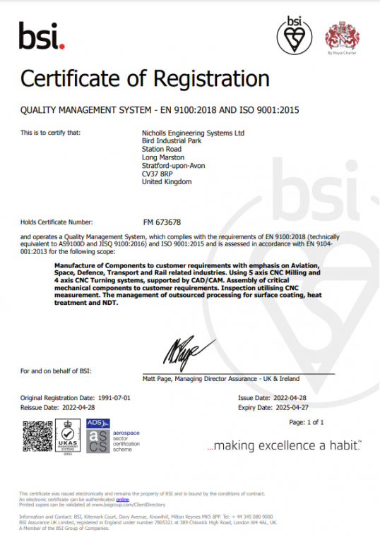 Nicholls Engineering Systems Ltd are accredited to AS9100 REV D EN 9100:2018 .